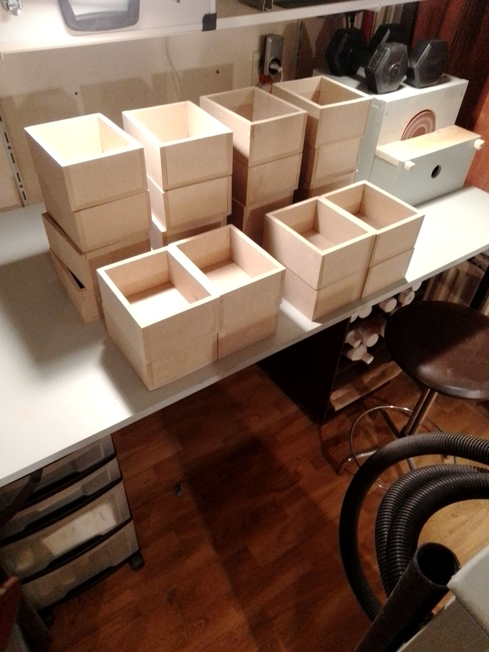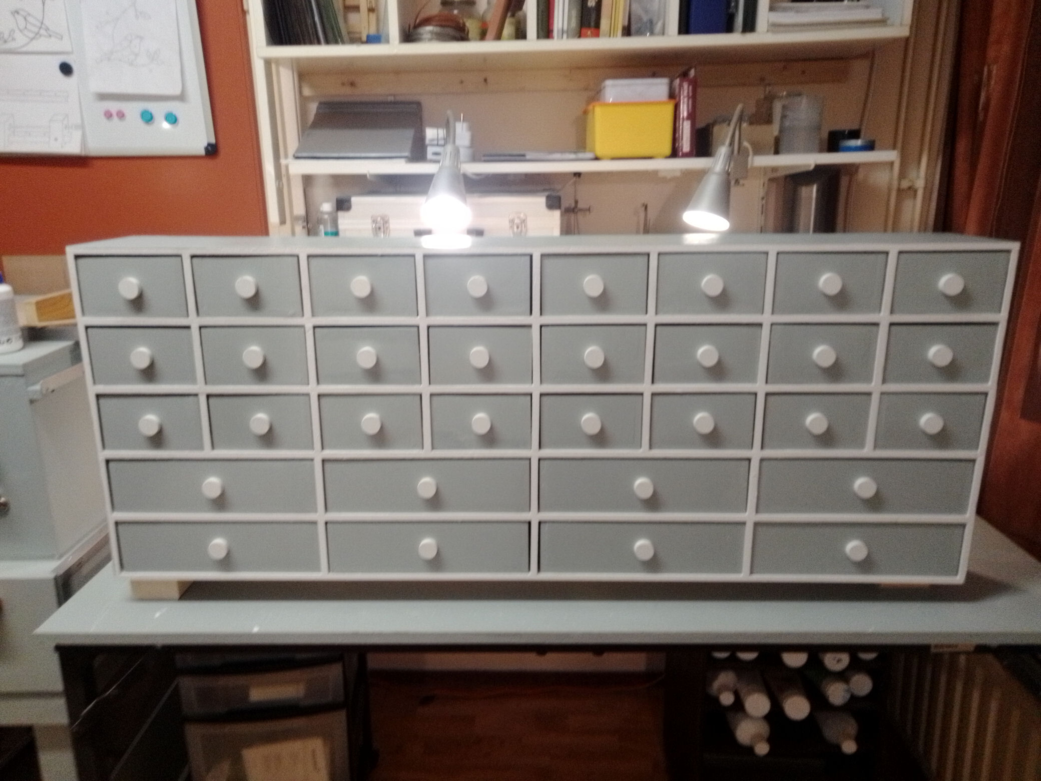 Deze ladenkast is gemaakt van Medium-Density-Fibreboard. MDF is extreem vlak en recht. Het is een zeer goedkope manier om kasten te maken.